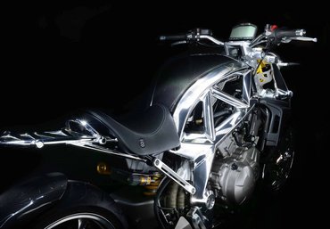 A váz felső része öleli körbe a szénszálas üzemanyagtartályt, illetve elég sok egyéb elem is karbonból készül, például a sárvédők, a hasidom és nagyjából minden, ahol normális gyártók sima műanyagot használnának.