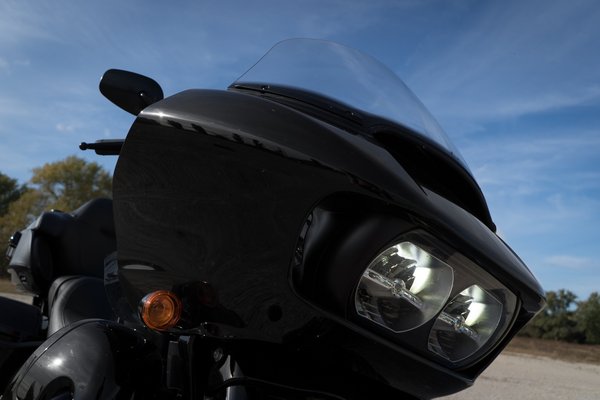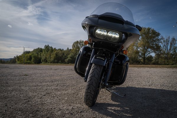 A Road Glide tehát egy Touring, a legnagyobb és legdrágább Harley-család tagja, aminek jól áll az utas. Vicces is úgy motorozni, hogy az ember mögött ott egy üres bőrfotel. A Road Kingtől abban különbözik, hogy nem egy mosógép forgódobja a lámpája, van viszont orbitális fejidoma. Orbitális fejidoma az Electra Glide-nak is van, csak azon a klasszikus Batwing, ezen meg Sharknose. Denevérek, cápák... A cápaorr talán kicsit modernebb, az én fejemben mindenesetre a batwing valahogy klasszikusabb. Ugyanakkor a sharknose sem egy 3-as szintű önvezetés; 1979-ben mutatták be, és úgy képzelem, ez se töltött szélcsatornában 10 másodpercnél több időt. A formája máshogy dögös, mint a batwingé, kicsit technóbb, mozdonyosabb, ami ebben az óriás túra műfajban nem hátrány. A szélcsatorna mellett az ergonómiával se sokat tököltek, például magunk előtt úgy 7-8 méteren nem látjuk az utat. Mindegy, megyünk emlékezetből.