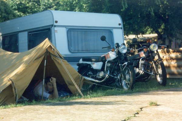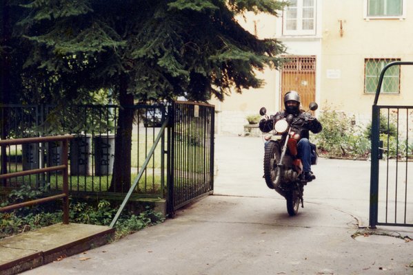 Volt vagy 13 éves, az Ecserin szereztük be, hogy – kezdetben persze illegálisan – legyen min gyakorolni, ami amúgy baromi nehezen ment, sokszor csak Simonek isteni türelme mentette meg a helyzetet, olyan béna voltam az elején, hogy egy disznó az űrhajóban jobban vezetett mint én. Ennek ellenére alig másfél hónap múlva, november közepére megvolt a jogsi is. A1, 125-re. Szigorúan. Emlékszem, amint kezemben volt a kis kártya – azt hiszem már mintha az lett volna de lehet hogy még papír volt –, taxival rohantam ki a Petzválból Pestimrére, hogy még aznap elindulhassunk az első közös motoros túránkra). Felnyaltam az MZ-re a Herbert von Karajan feliratot – egy ideig minden motoromat karmesterekről neveztem el, de ez a felirat egyszer egy éjszakai traffipax ellen hatásos védelemnek is bizonyult, annyira meghatotta az akkor még helyszínen intézkedő rendőrt -, és a következő májusig 36 ezer km megtételével bejártam az országot töviről hegyire.