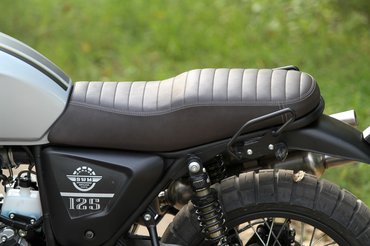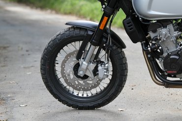A japánok talán eggyel plöttyedtebb futóművet használnának ebben a méretosztályban (bár vannak üdítő kivételek, mint a CB125R), ez inkább sportos és feszes, rossz utakon kicsit dobált és pattogott a kanyarokban, olyankor határozottan meg kellett célozni, hogy hova akarok érkezni, jó aszfalton viszont kiszámíthatóan viselkedett. A hátsó gátlókon ráadásul nem csak az előfeszítés állítható, hanem a csillapítás is, megéri esetleg tekergetni, de ezekből a sportosan rövid rugóutakból soha nem lesz enduró. Azért külön hálás vagyok, hogy nem valami noname kínai gumit dobnak fel rá a gyárban, hanem Pirelli Scorpion Rally STR-eket, elöl 120, hátul 150 mm-es szélességben. És úgy általában áldásos, hogy bár a tulajdonos kínai, a gyártás Olaszországban van, és a beszállítók jelentős része is helyi.