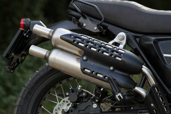 Stílusilag zavaros, mindenhonnan összelopkodott ötletek kavarognak, a széles kormány és a felhúzott dupla kipufogó a finoman bütykös gumikkal scrambleres alaphangot adnak, de a 17-es kerekek, a vaskos fordított teló a feszes hangolással már inkább café raceres, arról nem is beszélve, hogy a kipufogó csövei a katalizátorral a blokk és a váz alatt futnak, tehát a dob hiába van felhúzva, köves terepen ezek sérülnek először. Zavarosnak tehát zavaros, de attól még kiadja, olaszokkal pedig dizájnról nem vitatkozom, hiszen genetikai alapon mindig igazuk van.