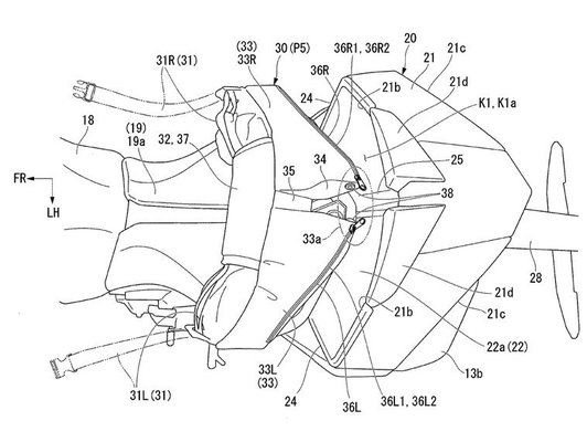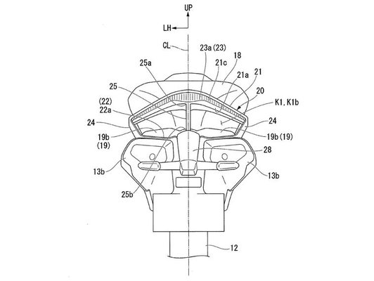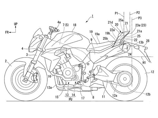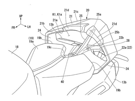 A japán szabadalmi hivatalnak beadott rajzokon tényleg egy hátsó spoiler látható, amelyet a farokidomra helyeztek el. A motorok fara egyébként sokat változott az elmúlt 30 évben, egyre rövdebbek lettek a sportmotorok faridomai - és míg egy életstílus-motornál divatot sejtenénk, a versenymotoroknál felmerül, hogy más megfontolások is vannak az evolúció mögött.