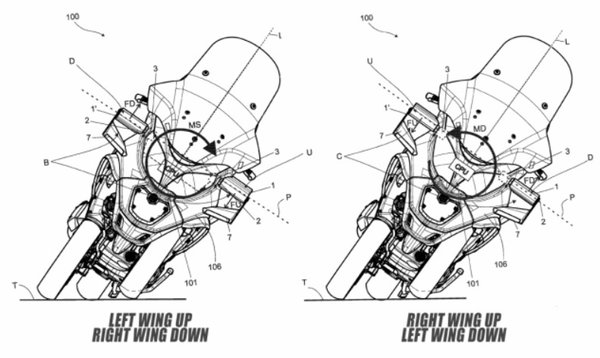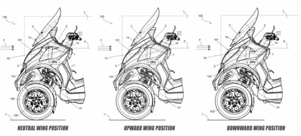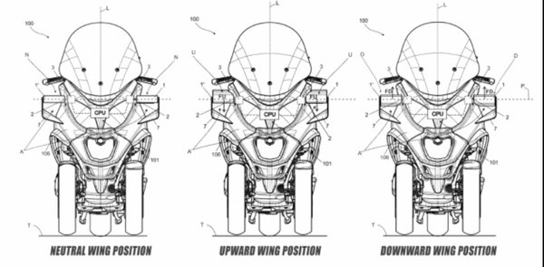 A szabadalmi rajzokon az első burkolat két oldalán egy-egy szárny látható, ráadásul a most futó aerodinamikai elemeknél ez még egy lépéssel tovább megy, hiszen aktív. Ez azt jelenti, hogy a szárnyak pozíciója a motorkerékpár mozgásától, sebességétől függően változik.