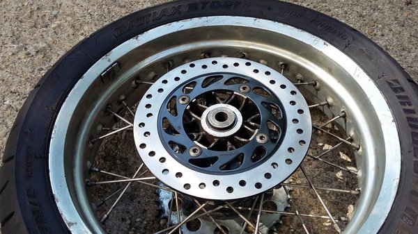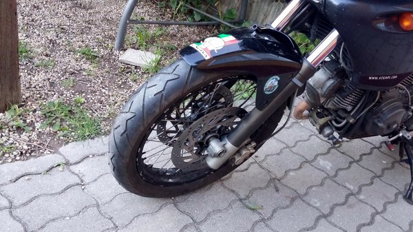 Már benne jártunk '19-ben, amikor az otthoni garázslejárón lehajtva furcsa percegésre lettem figyelmes a hátsó kerék irányából. Nekiültem, fogóval végigrángattam a küllőket, elöl is, hátul is egy-egy töröttet találtam köztük. Azzal a lendülettel elmotoroztam Koch Ferenchez Budafokra, aki két nap alatt kiigazította a hibát. Az alumínium ráfok olyan jó minőségűek itt, hogy végül nem is kellett állítani a többi küllőn, pedig a telefonos megbeszélésünknél még a kerékegyengetés és a teljes átfűzés réme is felderengett a horizonton.