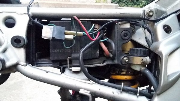 Megtaláltam amúgy a töltésvezérlő elektronikát is (téves szóhasználattal –feszszabályzót), amit a Ducati a kilencvenes években mindig a legrosszabb helyre, a burkolatok mögé rejtett el, ahol hűtés híján azok szétfőzték magukat, aztán velük ment egy csomó egyéb elektronika is.