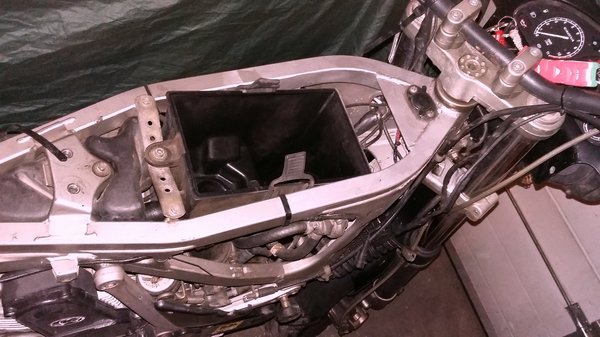 Az volt a baj, hogy csak homályos elképzeléseim voltak arról, hol lakhat a nagy testben az akkumulátor, Cagivákról pedig nincs sok szerelési tipp fenn a neten, mert kevesen vannak. Abban biztos voltam, hogy a két tankot le kell vennem, mert valahol alatta lesz, hiszen csak ott van elég hely egy akkunyi dobozkának, mellesleg meg mindkét Ducatink ott hordja az akksiját.