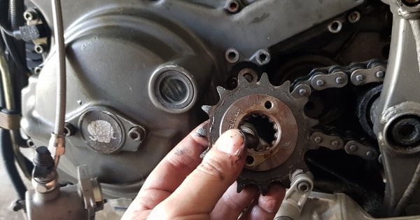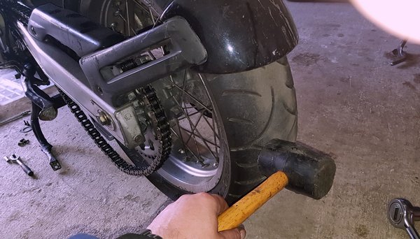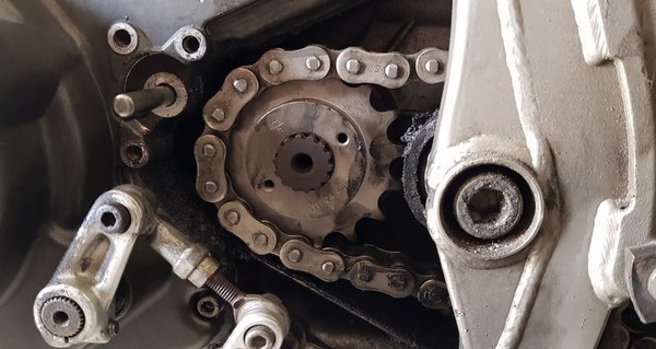 Hátul tengely lelazít, kis lánckerék fedele lecsavaroz, kuplungműködtető munkahengere levesz – eddig öt csavar. Magát a lánckereket egy elforgatott, két csavarral rögzített alátét tartja a bordás tengelyen, apró bűvészkedés, forgatás és máris a kezemben volt. Ez se bizonyult nagy mutatványnak.