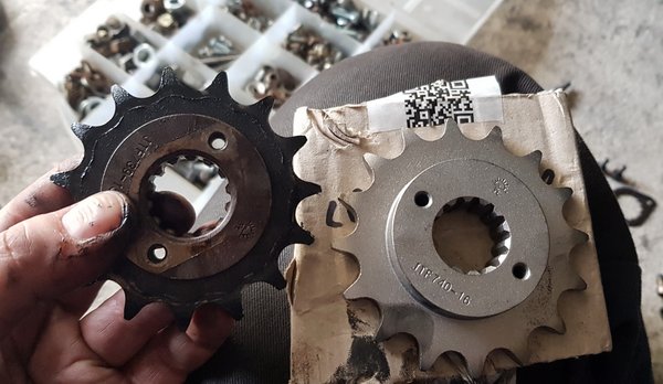 Ha már nekiláttam, elővettem a már egy évvel korábban beszerzett, egy foggal nagyobb (15 helyett 16 fogas) lánckereket is. A Cagiva Gran Canyon másik ismert hibája (a rossz szögű fejidomon, az utas fenekét melegítő, ülés alatt futó kipufogón és a gyenge üzemanyagszivattyú-rögzítésen kívül), hogy hiába nyomatékos a motorja, hiába van hat fokozata, mégis rövid az össz-áttétele.