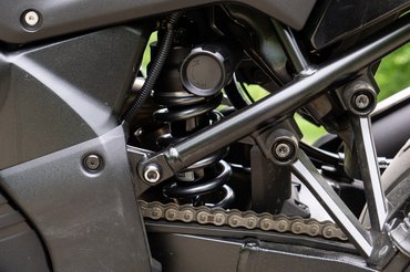 A futóműhöz sem nyúltak érdemben, bár elméletileg keményebb elöl a rugó, és feszesebb a csillapítás, de ilyen árnyalatokat már nem tudok három év távlatából felidézni - jó pont, hogy elöl-hátul állítható, ha elégedetlen lennél az alapbeállítással. A hangolásán érezni, hogy sportos motorozásra és jó minőségű aszfaltra lőtték be, kicsit talán sprőd is, ennek ellenére a földutakon sem volt szörnyű. Az egész motor viszonylag sportos és feszes, féktávon is alig bólint, és a hosszú, tempós kanyarokban sem kezd úgy ringani, mint az alap futóműves Honda CRF1100L.