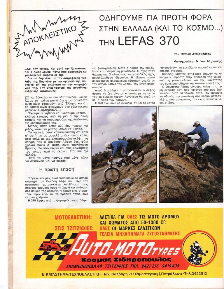 Lefas nem alkatrészekből legózott, érdektelen volt számára, hogy a Nissin vagy a Brembo féknyereg a jobb, ő megoldásokat keresett olyan problémákra, amibe addigra az ipar már rég beletörődött. 1982-ben döntött úgy először, hogy a fejében kavargó ötleteket motorrá gyúrja. Az első prototípusa egy 370 köbcentis, kétütemű triálmotor volt, melyet az athéni műhelyében rakott össze. A blokkon kívül mindent maga épített, és közben elkezdte előkészíteni a gyártást, megszervezni az infrastruktúrát.