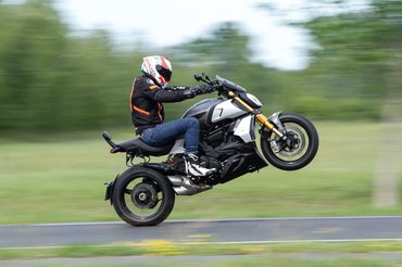 Az elektronika hozza az elvárásokat, már két kategóriával lejjebb is van motor, ami mindent tud, így ebből sem spóroltak ki semmit. Az üzemmódok között léptetve egyszerre vált az összes alrendszer, tehát a kanyar ABS, a kipörgésgátló és a teljesítményleadás, illetve ezeket a menüben külön-külön finomhangolhatjuk, visszaállíthatjuk a gyári értékre vagy ki is kapcsolhatunk mindent. Ez utóbbi opció huligánkodáshoz jól jöhet, egyébként a Bosch hattengelyű IMU-jával támogatott elektronika tökéletes partner abban, hogy a Diavelből kimotorozd a kimotorozandót. Annál pedig nincs barátibb összekacsintás, hogy ha már a Panigaléhoz lefejlesztették a rajtautomatikát, akkor ebbe is beleteszik - persze, túlzás, és a tulajdonosok sem fogják sűrűn használni, de ezek azok a finomságok, amit te meg én értünk, Karácsony Gergely pedig nem.