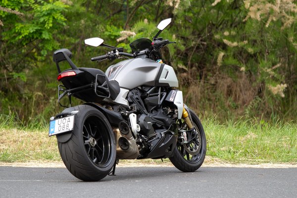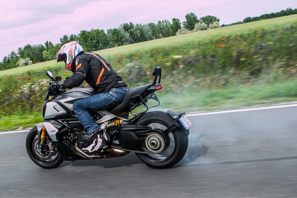 Amikor a Ducati tesztpilótáját, Alessandro Valiát arról faggatták, hogy mire a legbüszkébb, a Diavelt külön kiemelte, mert egyáltalán nem volt triviális, hogy ezzel a tengelytávval és a 240-es hátsó gumival így forduljon. A számok alapján egy zsák szerencsétlenségnek kéne lennie kanyarban, ehhez képest még a szerkesztőség sportmotorbubusai sem tudtak belekötni. A jóságban jelentős szerepe van a Pirellinek is, akik legyártották hozzá a Rosso III-at ebben az elbaszott méretben - 240 mm széles, ilyet a motorépítők raknak a szélesített Harley-k alá, annyi különbséggel, hogy ennek olyan a profilja, mint egy sportguminak.