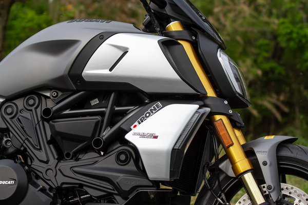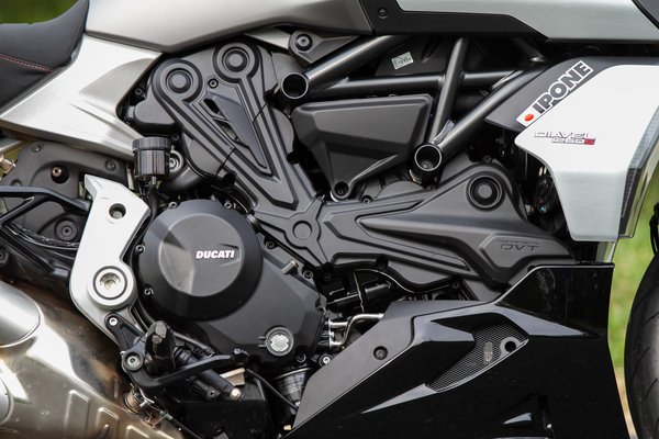 Az új váz és az alu lengőkar változásai nem feltűnőek, a cél mindkettővel a jobb kezelhetőség volt. Módosítottak például a hűtő felfogatásán, hogy a blokkot hátrébb tudják építeni, így közelebb legyen a tömegközépponthoz. Meredekebb lett a villaszög is, és a hátsó gátló új pozíciója sem véletlen, így tudtak növelni a rugóúton. Állítólag a régi Diavelt simán felírták vesekőre, ezzel viszont néhol elég gané utakon mentem, mégsem panaszkodtam. Hiába lett tehát hosszabb és nehezebb a korábbi szériánál, akik vezették mind a kettőt, állítják, hogy kezesebb lett.