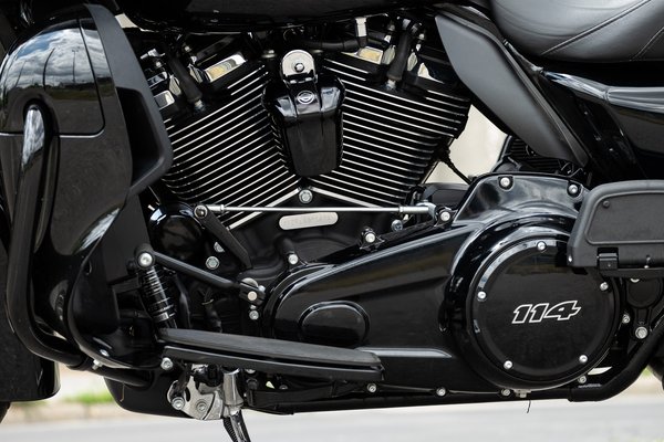 A motor... megváltás ahhoz a remegős, csak legközépen élni szerető, izzó lávatömbszerű egyhatoshoz képest, ami a Road Kingben volt. Abszolút értékben is lenyűgöző. Itt most a Twin Cooled Milwaukee-Eight 114-ről (ugye, „one-one-four”) van szó, ami egy alig pár éve bemutatott, vadiúj szériából származik. Ebben négyszelepesek a hengerfejek, utóbbiak pedig folyadékkal hűtöttek (csak a hengerek levegősek), a blokk mélyében pedig kiegyensúlyozótengely pörög. A régi vékettesnek egy nem egészen ezerötszázas sáv (nagyjából 1700-tól 3000-ig) volt a komfortzónája, ennek itt bő háromezer.