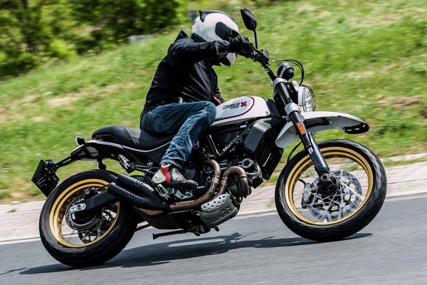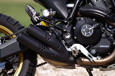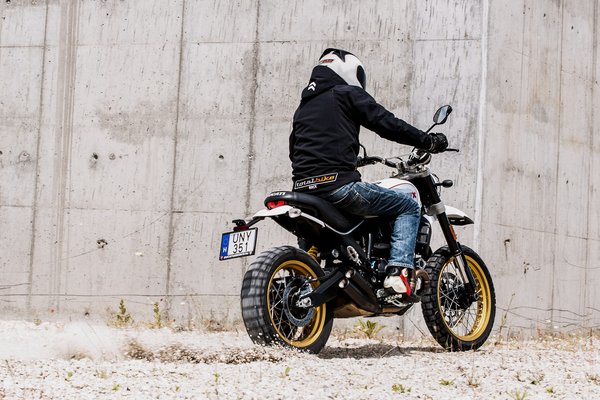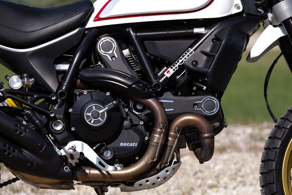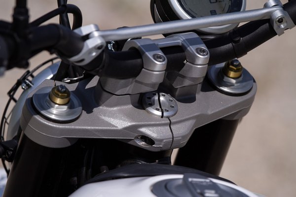 A vázhoz nem nyúltak, de hogy az emeléstől és a hosszabb lengővillától ne essen szét teljesen a geometria, a villahidakon módosítottak, így megmaradt a 24 fokos villaszög és a 112 mm-es utánfutás, a tengelytáv viszont végül 1455 mm-ről 1505-re nőtt. Így hirtelen rengeteg hely lett a motoron, a földszintes Scramblerek azért nem nagypolgári lakások, ezen viszont már magasabb fickók is jól elférnek. Attól, hogy az egész magasabb lett, már nem benne ülsz a motorban, hanem rajta, egészen más élmény motorozni vele. Aki a terepmotorokat és a szupermotókat szereti, jellemzően ezt az élményt keresi utcán is. A 860 mm-es ülésmagasság kizárja az alacsony pilótákat, még nem toronydaru, de az utcai Scramblerek 790 mm-ével szemben erről 170 centi alatt már nem egyértelmű, hogy leér-e a láb.