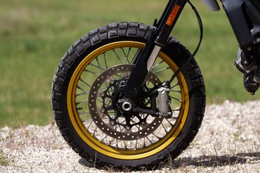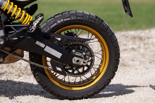 Az igazán fontos részekhez 2016 óta nem nyúltak: az első kerék 19 collos, a felnik fűzöttek, az alap Scramblereknél 25 mm-rel hosszabb a lengővilla, a rugóútba pedig tekintélyes 5 centit toldottak - ezzel 200 mm, ami már túraenduróknál is tisztességes. A Kayabától származó futómű is komolyabb annál, mint ami például a Full Throttle-ben is van, a 46 mm-es villán és a központi rugóstagon például egyaránt állítható rugóelőfeszítés és a húzófokozati csillapítás.