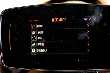 3 másodperc a 0-100. Nem az volt, hogy már évek (évtizedek?) óta nemhogy a végsebességet nem kommunikálják a motoroknál, de a gyorsulást sem? A 158 kilométeres városi hatótáv kicsit elrettentő, én legalábbis nem szeretnék ekkora döggel városban közlekedni. Országúton pedig gyorsan elvész az elektromos hajtás világmegváltó/környezetvédő tudománya. A tableten négy különböző rájding módot állíthatunk be: sport, road, rain és range - ez eco talán azért maradt ki, mert a Vatikán leszólt, hogy az energiatakarékos üzem szentségtörési okokból legyen inkább range. Meglepő módon a road jobban különbözik az előző kettőtől, amennyiben a vadabb gázreakciót hamar megszokjuk, a bivaly motorféknek még sokáig örülünk. Olyan ez, mint a hibrid- és villanyautók B, más néven egypedálos módja, amikor gázelvételre olyan lelkes rekuperálásba kezd a motor, hogy a rendes fékekre gyakorlatilag csak vészhelyzetben lesz szükség.
