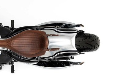 A BMW hagyományaira utal a finoman veséket formázó első lámpa és a fekete fényezésen futó fehér dupla pinstripe-ok. A különböző felületkezelések egyébként nagyon szépen váltakoznak, folyamatosan vezetve a tekintetet egyik érdekes részletről a másikra.