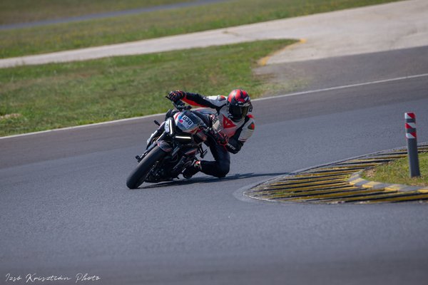 Az RS-nek ez a lendületes pálya is nagyon fekszik, csupasz motor létére meglepő módon a célegyenesben sem szenved hátrányt az idomos hatkilósoktól. Sőt! Konkrétan erőből kerültem ki a célegyenesben egy R6 R-t és egy Daytonát. Az oda-vissza gyorsváltó pedig tényleg áldás, mert több helyen is kell lefektetett motorral váltani. Az egykerekezős bukkanó után ötből kell kettőbe vissza dobálni, és így a fékezésen kívül semmire sem kell figyelni – az elektronika helyetted adja a gázfröccsöt, a csúszókuplungos motor végig stabil marad. Ádám már régebben panaszkodott a 2020-as modell kikapcsolhatatlan ABS-ére. Bár a Track mód enged némi játékot a hátuljának, a Pannóniaring cél végi aszfalthibája tényleg összezavarja. Valóban nem túl megnyugtató, mikor hatodik nyélgáz után próbálod a gyors jobbost elfordulni, az elektronika meg az aszfaltban lévő keresztborda miatt elveszi a fékerőt.