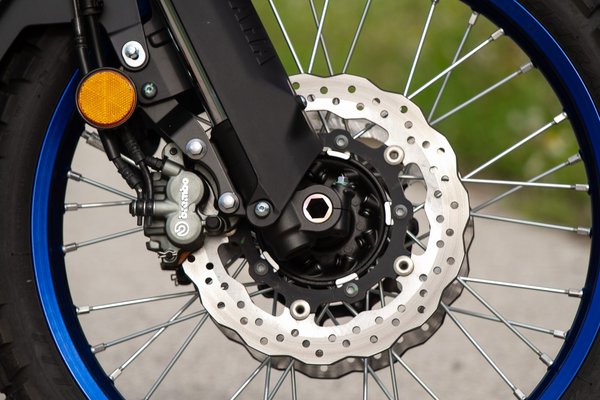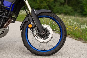 A terepképességet végre komolyan vették, a 21-es első és a 18-as hátsó kerék már önmagában jó jel - a gumi elöl 90/90-es, hátul 150/70-es, tehát ha komolyan vennéd a dagonyában vadulást, nyitva van a kapu, ebben a méretben elég jó bütykösöket is kapni, nem csak aszfaltra szánt papucsok közül válogathatsz. Érdekes, hogy erre ugyanazokat a Pirelli Rally STR gumikat szerelik gyárilag, mint a Ducati Desert Sledre, de míg a Scramblernél zavart, hogy a minta nagy tempónál berázza a motort, ennél valahogyan nem éreztem. Lehet, hogy azóta megvett kilóra a Pirelli, de az is lehet, hogy a Yamahánál megoldották, hogy a futómű frekvenciái kioltsák egymást.