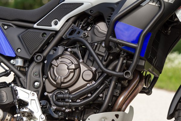 A tervezők szabadon alkothattak - a CP2-es blokk jelentette az egyetlen megkötést, de egy ilyen kéthengeres köré édes feladat motort építeni. A vázat már nem vették át az MT-07-ből, azt újratervezték, hogy ne csak egy megemelt utcai motor legyen, mint a Tracer 700, hanem enduróként is megállja a helyét. Míg a BMW F 750 és F 850-nél folyamatosan ott motoszkál az érzés, hogy itt-ott direkt visszafogták, nehogy elvegye a vevőt a bokszerektől, a Yamahánál viszont nincs ilyen gyanú (a Triumph-nál sincs, a KTM-nél pedig csak az alap 790 volt lehangoló, az R-nél mindent beleadtak).