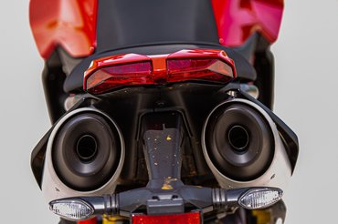 Először is, újra veszett jól néz ki. Visszahozták a legelső generáció fent elhelyezett kipufogóját, csak ezek a tömzsi kis trombiták még vagányabbak. És bizony a hangjuk pont olyan jó, mint ahogy kinéznek: igazi telt, kellően hangos vékettes dohogás, az agyonszabályzott emissziós normák ellenére is. Az összekötő csövek pont úgy kunkorodnak, mint anno a 916-oson – nem is értem, hogy tudták ezt megoldani az új motorokon általános óriási középdob nélkül. A dobok felett ékszerként ül a kis szárnyacskába integrált hátsó lámpa, a jóval keskenyebb ülést pedig öntött alumínium helyett újra mívesen hegesztett térhálós segédváz tartja.