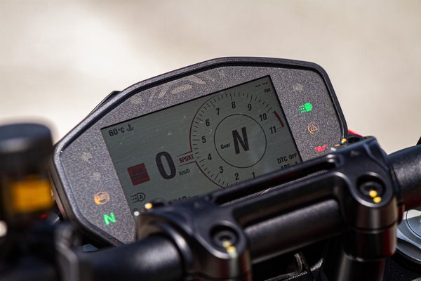Csak az kevésbé teszi beléd a kisördögöt, hogy ön- és közveszélyes módon közlekedj. A korszellem jegyében természetesen az összes modern vezetéssegédlet megtalálható a fedélzeten és mindegyiket ki lehet kapcsolni. Mert hát mi értelme lenne egy olyan supermotónak, amivel nem lehet egykerekezni vagy ide-oda csúszkálni? Az előbbi feladat a magas felépítés és a bőséges nyomaték ellenére nem is olyan egyszerű, mint azt elsőre gondoltam. Hiába, az elektromos gáz talán már soha nem fogja adni azt a közvetlen érzést, mint amikor még a jó öreg bovdennel nyitottuk a fojtószelepet. Urban módban csak a teljesítmény 75 százalékát adja le, a Touringban az egészet, Sportban pedig jóval élesebb a gázreakció.