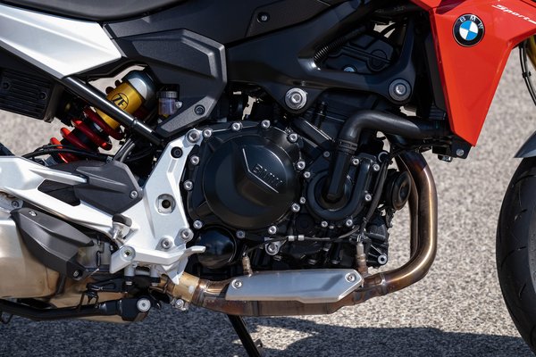 Az F 900 R ugyanazzal a sorkettes, 270/450 fokos elékelésű, vizes blokkal működik, mint az XR – ez amúgy a kínai Loncinnál már 2007 óta készülő kéthengeres legutolsó inkarnációja. Nem egy szép blokk – a vizes sorkettesek nehezen tudnak azok lenni -, de rossznak senki nem mondja, sem a megbízhatóságát, sem a finomságát tekintve. Hogy a motor csúnyaságát eldugja szem elől, a BMW az egészet telibe festi feketére, mint tanyasi simsonos, amikor kap három doboz ingyen Prevent mattfeketét. De a szintén fekete (viszont szép vonalú) vázban megbújva így már nem zavarja a szemet.