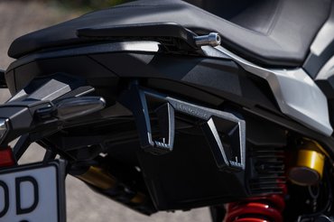 Tényleg ez az egyetlen igazán kellemetlen részlete – oké, akad még két kisebb, a bizonyos napsütés-szögeknél vakítóvá váló matt-króm kormánycső és a mutatóujj-hosszúságú hüvelykujjat igénylő indexgomb, amit iszonyú messzire tettek a markolattól – a motornak. Egy olyan elrontott elem, ami félek, a túrázók életét megkeseríti majd, nem értem a bajoroknak miből van a hátsó felük. Titánból? Zsírból? Pedig amúgy túrázni lehet az F 900 R-rel – én a dobozokat sajnos nem (pedig milyen jól jött volna legalább egy) kaptam meg, de a motor túracsomagos volt (198 600 forint értékben), e pakk része pedig a tempomat, a középsztender, a navigáció-előkészítés és a koffertartó állványok.