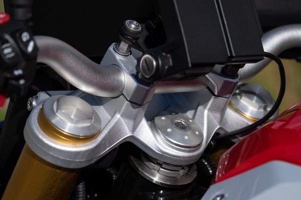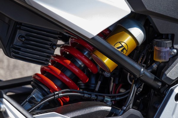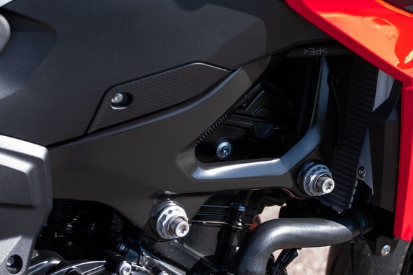 A blokknál, ha megjelenésre nem is, de hangban legalább megtalálták a dögöt. Az eltoltan dolgozó dugattyúk eleve adnak egy nagyon nem sorkettes, sokkal inkább vékettőnek tűnő lüktetést a kisebb fordulatokon előjövő gázlengéseknek, amelyek meglepően hangosak is – el is gondolkoztam, vajon ez a motor tényleg tudja az Euro 5-ös zajnormát? Nyilván, különben nem engednék forgalmazni, de az biztos, hogy nem csendes. Már alapjáraton is jó, kicsit ideges a lüktetése, de fordulattól és gázállástól függően még egy csomó fajta egyéb dalt is tud. Meglepően széles a repertoár, ez kivételesen egy olyan 2020-as gép, amire csak a kipufogómorajért is lehet vágyni.