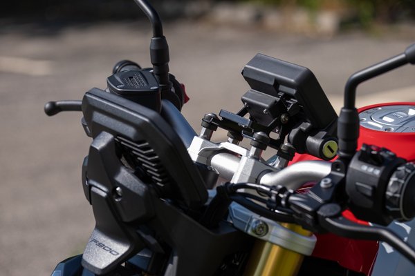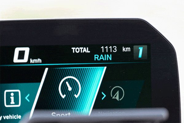 A panel a bal kéznél levő üzemmódválasztóval átváltható rendes, mutatós, kerek fordulatszámmérősre, ilyenkor pedig kétoldalt a gyorsulásmérő és a dőlésmérő is játékba lép, de van köridő-mérő funkció, jármű-diagnosztika és természetesen mindenre kiterjedő fedélzeti számítógépes adatszolgáltatás is. Ha pedig valaki rá tudja cuppantani a BMW-navigáció alapkészülékét is a kormányon levő, előkészített tartókonzolra, akkor a térképet is ezen a nagy, és tényleg alig-alig tükröző kijelzőn jeleníti meg a motor. A készüléket nem tudtam megszerezni a tesztre, tehát nem tudom, hogy néz ki a képe.