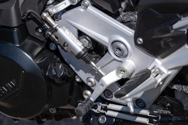 No, és ott a gyorsváltó, amely kuplung nélküli, villámgyors kapcsolásokat tesz lehetővé a fokozatok között. Ez, mint a hasonló szerkezetek általában, 4000-es fordulat alatt használva inkább csak masszív csattanásokkal kísért rántásokat idéz elő, s csak nagyobb fordulaton működik jól – de ott istenien. Fejben mindig el kell dönteni – andalgás van-e (akkor kuplunggal váltunk), vagy zúzás (akkor lehet pőrén rugdalni a gépet). Ha már itt tartunk – a váltót elég karcosnak találtam a tesztmotoron (alig 1000 km volt benne, amikor megkaptam), de az útja rövid, jól érezhetőek a fokozatok, ez a fajta kelletlenség pedig pár ezer alatt remélhetőleg elmúlik belőle.