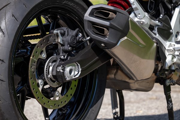 A habkönnyűen omlós és friss futómű, a jól adagolható, tökös első fék (duplán a négydugattyús, 320-as tárcsákkal működő radiális Brembók – mi bajunk lehet-alapon), az igazán fasza üléshelyzet után az első, ami feltűnt, hogy ennek a motornak erősen közepes a hátsó fékje (265 mm-es, egydugattyús, úszónyerges Brembo) és szerény a nyomatéka. Megcsavarva, kihúzatva rendesen nagyot lép, ráadásul igen kevés vibrációval, de lent valahogy nógatni kellett. Nem rázkódott, nem kezdte tépni a láncot, elvitte simán a kétezres fordulatot, csak valahogy nem akarta. Pedig papíron van neki nyomatéka – 92 Nm 6500-nál –, csak azt a sok akaratot nem találtam sehol.