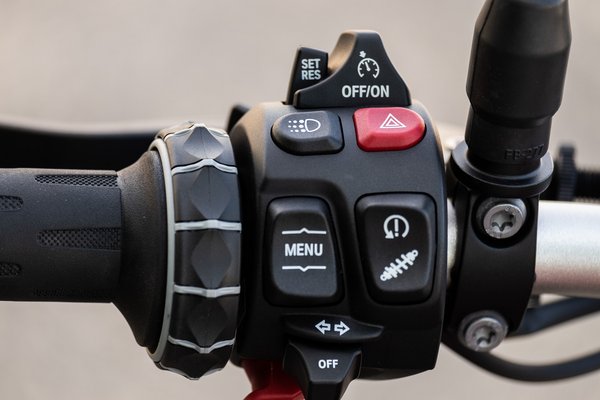 Nem szóltam még pár, motoron szerintem nem igazán létfontosságú funkcióról, amit az F 900 R tud. Ezek java része a szinte már autóba való méretű, 6,5-es képátlójú TFT-kijelző köré csoportosul – ez az F 900 R-en egyébként át is veszi minden egyéb kijelző és világító biszbasz szerepét is. Hasonló van a konkurencián is, de nem ekkora. Alap-üzemmódban egy fordulatszám/teljesítmény-grafikon formában elrendezett fordszámmérő csücsül a fő helyen, a szabadon maradt sarkokban pedig a sebességet és a bekapcsolt fokozatot látjuk, számokkal, illetve alul és felül az egyéb információkat. Az egyéb információk felső sora elég sokrétűen változtatható, mutathatja itt a BMW a tank állapotát, a megtehető kilométerek számát, a fogyasztást, a napi számlálót – szóval sok mindent.