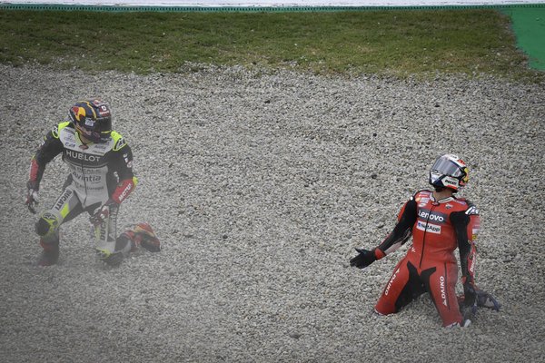 Míg a francia Johann Zarco a hatodik helyről rajtolt, addig a gyári motoron ülő, versenyre világbajnoki listavezetőként érkező Andrea Dovizioso a tizenhetedikről. Igen, jól olvasták. A rajtot végül Dovizioso zseniálisan abszolválta, és Zarco mögött fordult, úgy a hatodik-hetedik helyen, amikor Petrucci megcsúszott, mögötte Zarco berántotta az első féket, bukott, és magával rántotta Dovizosót. Dominó-effektus, írhatnám, egy szerencsétlen, mégsem teljesen szokatlan versenybaleset.