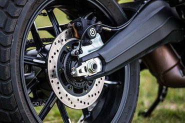 A fékeket természetesen a Brembo szállítja, elöl két 320 mm-es tárcsa és négydugattyús, radiális M4.32 lassítja a tizennyolcas első kereket, míg a hátsó tizenheteset egy szerényebb, 245 mm-es tárcsa, és egydugattyús nyereg. Talán fontos adalék, hogy az ABS-t egyetlen üzemmódban sem lehet kikapcsolni.