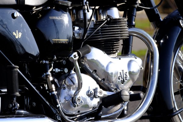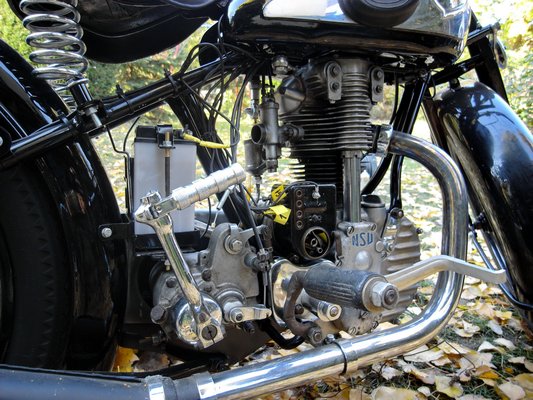 De a brit rendszerű, súrlódótárcsás kormánylengés-csillapítón is míves, krómozott tekerő van, s mivel ez már egy modernizált, '38-as modell, itt a szelepek tokozottak (tehát nem látszik, hogy szabadon kalimpálnak a himbák, ugrának a szelepszárak, mint egy évvel korábban), s a váltót sem jobb kézzel, a tank oldalán levő karral kell kapcsolni, hanem lábbal, mint egy modern motoron.