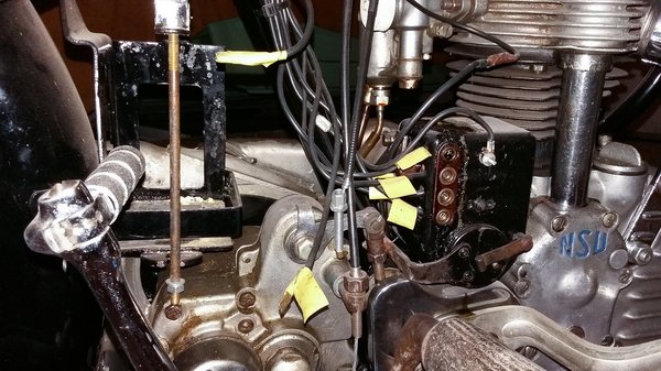 A szelepállítás azonban zseniális, egyébként pont olyan, mint a Honda Spacy-men (vagy emiatt a Helixen és a 250-es Piaggio Hexagonon is), s a mai igényesebb robogók blokkján – a himbatengely végén excenter van, melynek elforgatása a szelephez és a vezérműtengely bütykéhez képest el tudja mozdítani a himbát. Kívülről mindkét himbatengely-excenternek állítókája van – az NSU-n ezek tízes hatlapfejű csavarok, amelyek fixen együtt mozognak egy skálával. Állításhoz az ember felső holtponthoz állítja a motort (kompresszió-ütemben), fellazítja az excentereket, mindkettővel érintőt vesz a szelepeken, majd a skálán leolvasva beállít 0,2 mm-nyi hézagot. Ennyi, semmi szelepfedél-leszedés, tömítéscsere, hézagmérővel szurkálás, törölgetés. Elegáns ez is.
