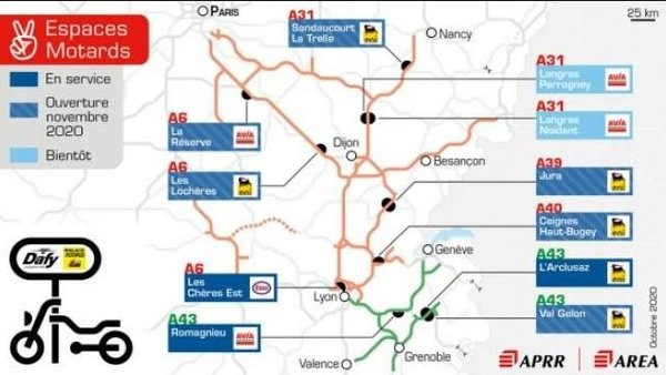 Az APRR (Autoroutes Paris-Rhin-Rhône) autópályák mentén a pihenőhelyeken motorosbarát sarkokat alakítanak ki, ezzel biztosítva, hogy a motoros túrázók komfortosabban tölthessék el az időt megállóik során, és biztonságosabb legyen az útjuk. Ezeken a motorosbarát megállóknál lesz elérhető láncspré, gumijavító készlet, tisztítószerek és esőruha is, illetve zárható sisaktároló is. Ezen felül pedig lesz lehetőség arra, hogy az elázott motorosok meg tudják szárítani a motyóikat, mielőtt továbbállnak.