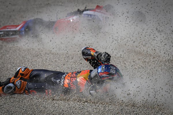 Not the start that @jackmilleraus and @BradBinder_41 both had in mind 😢The pair crashing out at Turn 2 on the opening lap! 💥#AlcanizGP 🏁 pic.twitter.com/v92yXwOniE — MotoGP™🏁 (@MotoGP) October 25, 2020