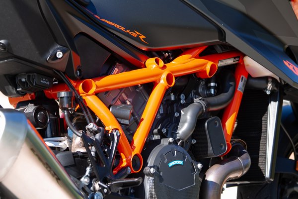A 1290 Super Duke R korábban a szerpentinek vadászbombázója volt, most viszont határozottan a versenypálya felé fordították, a váz, a geometria és a futómű változtatásai is erről szólnak. Az eddigi térhálós váz leegyszerűsödött, kevesebb darabból áll, kevesebb hegesztés kell hozzá, gyártani is olcsóbb, de közben merevebb és könnyebb is lett. Vegyesen használnak hozzá kör és ovál keresztmetszetű csöveket - a MotoGP-ben is ez hozta meg számukra az áttörést, és itt sem az utcai motorosok és a túrázók igényeit követték. Olvasni kell a jeleket, például hogy a váltó egyetlen csavarral megfordítható.