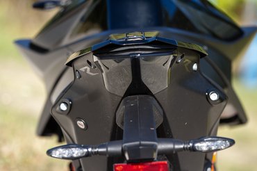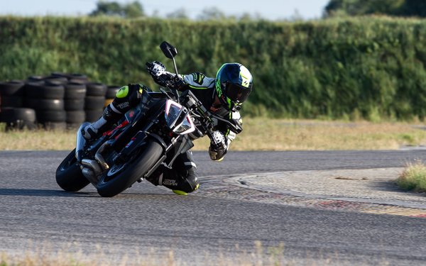A váz merevebb lett, az egyoldai lengőkar és a tengelytáv hosszabb, a villaszögön vadítottak 0,7 fokot, magasabbra építették be a blokkot, állítólag jobb lett az első kerékről a visszajelzés is, de ezek már a pályanapok gyors csoportjában számítanak csak, ahogyan a 200-as hátsó gumi sem a Balaton-felvidéki gurulásokhoz kell. Az új futómű, ha nem is vészesen, de rázósabb lett utcán, mondom, itt egy úgynevezett átpozícionálás történt. Akkor irány a pálya.