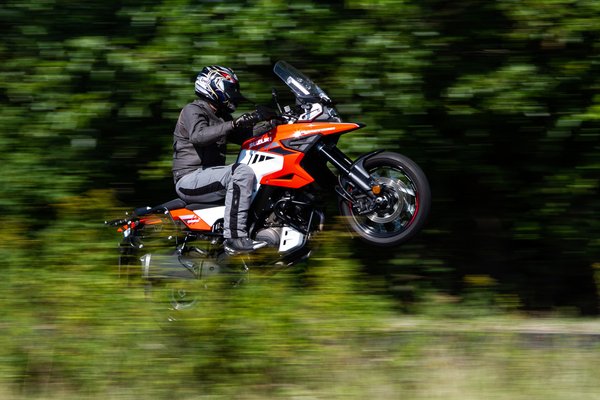 A kérdésre, hogy összességében melyik jobb, képtelenség normális választ adni. Ha neked a motorozás a kényelmet és az utazást jelenti, akkor nem fogod érteni, mit eszik a másik hülye a V-Stromon. Pedig arra is van magyarázat, örömmotorozni azon jobb. Ha szereted a kanyarokat, hogy a mechanikai tökéletességből fakadóan követi a gondolataidat, akkor a Suzuki felel meg az elvárásaidnak. A futóműért jár az elismerésem, egy minden tekintetben hagyományos (se Big Piston, se Separate Function) fordított telópár elöl, és egy mezei, himbarendszerrel az alu hídvázhoz csatlakoztatott központi rugóstag hátul – a kulcsszó a kiforrottság. Állítási lehetőség is van, mégha nem is gombnyomásra, szűkebb az a tartomány, ahol ideális lesz, de amit tud, abban nagyon jó. A hangolása kimondottan sportos, a 160 mm rugóút nem sok, ez a túraenduró műfajnak a rövidebb vége.
