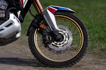 A Honda egészen máshogy álomszerű, a feláras Showa EERA futóműve szélesebb tartományban jó, egyáltalán nem túlzás azt állítani, hogy gombnyomásra változik hard enduróból kényelmes utazómotorrá – offroad módba rakva például szemmel is jól látható módon centiket emel a hátulján. A rendelkezésre álló rugóút is több, elöl 230, hátul 220 mm, de a legfeszesebb állásban is kényelmesebb a Suzukinál. A Honda a villanyfutóművel mindent tud, kanyarban mégsem annyira csibész, amire csak részben magyarázat a 21-18 collos kerékméret (a Suzukin elöl 19-es, hátul 17-es van) és a hosszabb tengelytáv, a mindenes futóműben ez a kompromisszum. Tágabb határok között kell dolgoznia, meg hát ugyanazokban a telótestekben el kell férnie az elektromotoroknak is, amik a beállításokat arrébb húzzák helyetted - ergo maguknak a csillapítóegységeknek kevesebb hely jut, a működésük sem lesz olyan kifinomult.