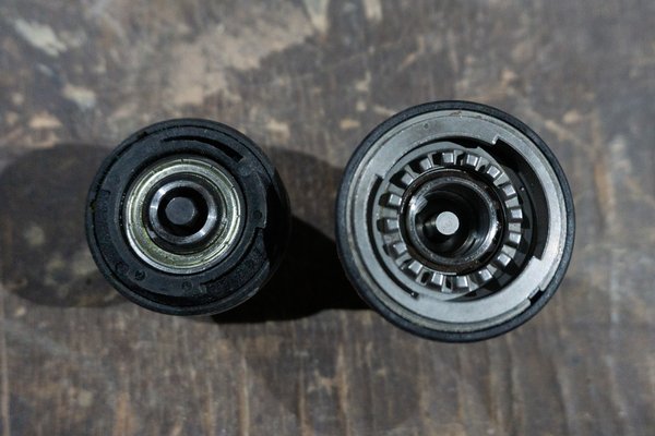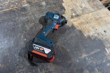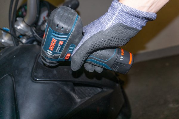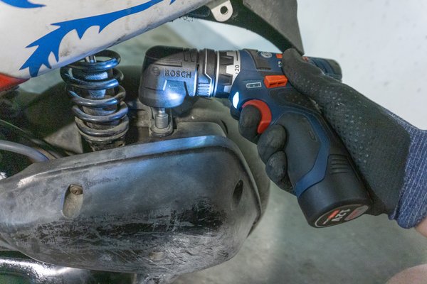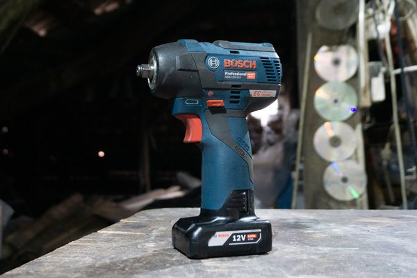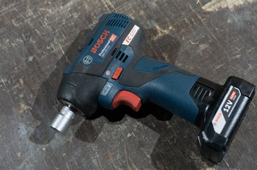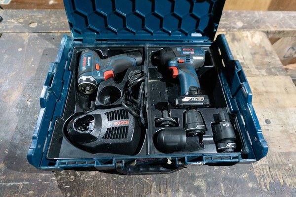 A 12V-os GSR párja a GDS 12V-115 nevű ütvecsavarozó - ugyanazt a 12V-os rendszert használja, de ezt a 2 Ah-s helyett egy 6 Ah-s akkuval adták. Ez már BL motoros gép, és több kivitelben létezik - van ¼ collos belső hatlap szerszámbefogású is (GDR 12V), ez viszont a ⅜ collos kulcsnyílású változat. Apró probléma, hogy a gépi dugókulcsaim mind fél collosak, így sima króm-vanádium szerszámokkal használtam - azoknál a finom szereléseknél, amikhez használtam, nem volt vele gond, nem fenyegetett a dugókulcsok törése. A motorom féknyergének a csavarjait, amelyek egyébként a szervizkönyv alapján 35 Nm-re lennének lehúzva, de valószínűleg jó szokás szerint meg voltak tépve, azokat például nem szedte le. Csodák nincsenek, az ütvecsavarozó ütőerejéhez tömeg kell, ez meg egy könnyű gép.