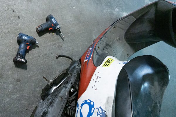 Mivel a Berzit és a feleségem Dióját is szereltem eleget, így pontosan tudtam, hogy mit és milyen sorrendben kell lebontani, hogy ki tudjam bányászni a szívócsonkot, és pontosan tudom azt is, hogy mindez mennyi ideig tart. A karburátort és a légszűrőt takaró műanyagokat gépesítve percek alatt lekaptam, és bár kétféle szerszám kell hozzá, mert nem egyféle csavarméretet használnak, de logikusan épül fel, nem kell különösebben szortírozni, egyértelmű, hogy hova melyik megy majd vissza.