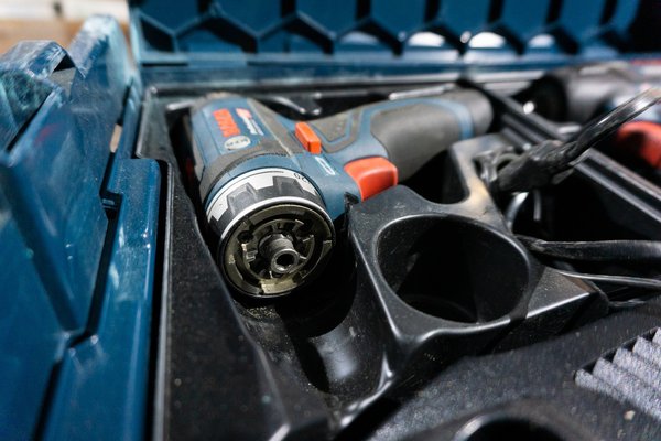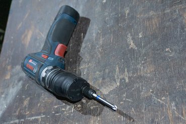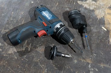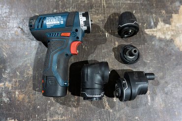 Az egész teszt onnan indult, hogy régóta szemezek a Bosch GSR 12V-15FC-vel, a cserélhető fejű fúró-csavarozóval, ezért kölcsönkértem egyet - van több fúróm, vezetékes, aksis, kicsi és nagy, de ez az, ami az igényeimnek megfelelne: kicsi, könnyű, sokoldalú. Az alap fúró-csvarazókkal szemben a legfőbb extrája a FlexiClick rendszer, melynek lényege, hogy a beépített mágneses bittartóra további négyféle adapter húzható: fúrótokmány, gyorszáras bittartó, sarokadapter és egy excenteradapter, és ezek több pozícióban is rögzíthetők, illetve ami még fontosabb, villámgyorsan cserélhetők.