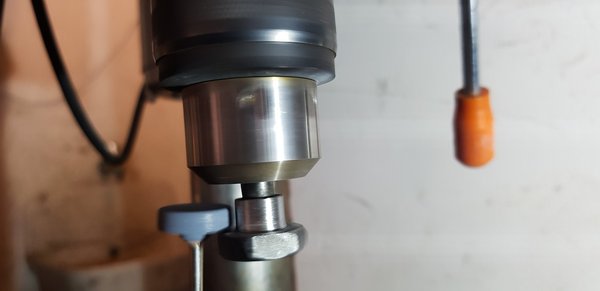 Sóhajtottam, megnéztem a pénzes zacskó alját, aztán jobb híján vettem egy ilyen új sztendert, mert ez legalább korrekt tervezés. Két nap, megjött, persze nem volt jó bele a másikhoz gyártott, Fűrész Feri bácsi-féle két, galléros csavar. Szerencsére azokat az eredeti, már kitágult lyukú, régi sztenderhez készíttettem, ezt az újat pedig a gyári méretre készítette valaki, tehát kisebb volt a lyuk, csak le kellett szedni a csavarból. A százéves esztergámat még nem sikerült megcsinálnom (vizet kapott a sín és rozsdás lett, a tokmány kúpos bronzcsapágya meg lötyög, még ki kell találnom, mit csinálok vele), ezért a 12 ezer forintos állványos fúrómmal és a kézi dremelemmel állítottam össze egy módfelett pontatlan, de a célnak épp megfelelő eszterga-köszörűrendszert, s lehúztam kisebbre a csavarok gallérjait. Azért elég pontosak lettek, lehet utánamérni...