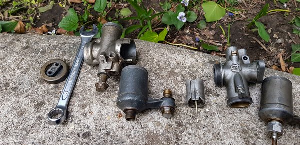 Viszont az a csőcsonk számomra tökéletesnek bizonyult a nem-NSU-rögzítéses Graetzinek felpróbálásához. Rájöttem ugyanis, hogy éppen az NSU-ra való, kétfüles Graetzin a legkopottabb az összes karbi közül, például kotyogott benne a teljes súber (nem a tű, hanem a légtorokban levő dugattyú) is, de egyéb bajai is akadtak. Tehát a csöves rögzítésűek valamelyikét kell használnom, mert azok sokkal passzentosabbak voltak. És sajnos nem a dugattyú volt a kopott, hanem a ház, mielőtt még valaki közbekotyogja, hogy miért nem tettem át valamelyik jó súbert egy másik karbiból. Ezt az eredeti NSU-félét is meg lehetne menteni, láttunk már perselyezett karburátort, de arra nem volt érkezésem, hiszen akadt a sifonérban jó is.