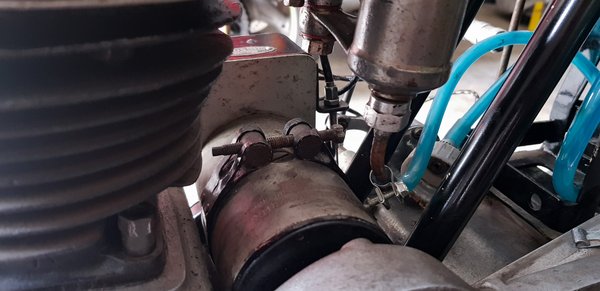 Szóval a karbi. Egyetlen klasszik, kétfüles, igazán NSU-ra való példányom volt. A másik három viszont ugyanaz a típus, de csőcsonkra szorítós fajta. Szerencsére Miki előttem már odáig eljutott, hogy a motor nem igazán akar működni a saját Graetzinjével, ezért egy Pannónia-féle Jikov-karbihoz készített egy kétfüles, felcsavarozható csőcsonkot.